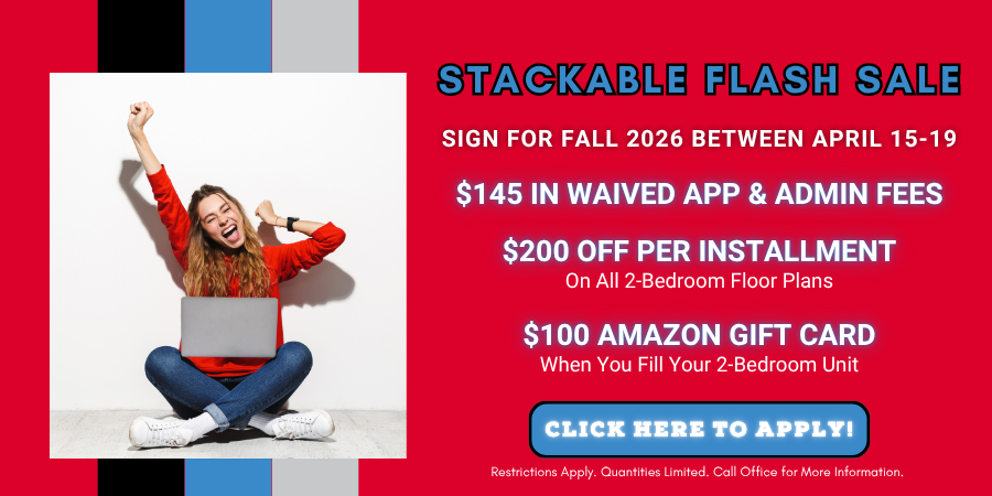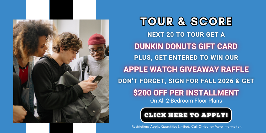 Enjoy the college experience while also taking a load off with high-end amenities such as an exclusive yoga studio, fitness center, and penthouse lounge. There’s no better place to call home.